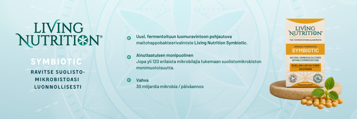 Living Nutrition Symbiotic on fermentoituun luomuravintoon perustuva maitohappobakteerivalmiste, joka sisältää ainutlaatuisen monipuolisen kirjon hyödyllisiä mikrobilajeja tukemaan suolistomikrobiston monimuotoisuutta. Tuote on valmistettu perinteisellä maitohappokäymisellä fermentoidusta GMO-vapaasta luomusoijasta.